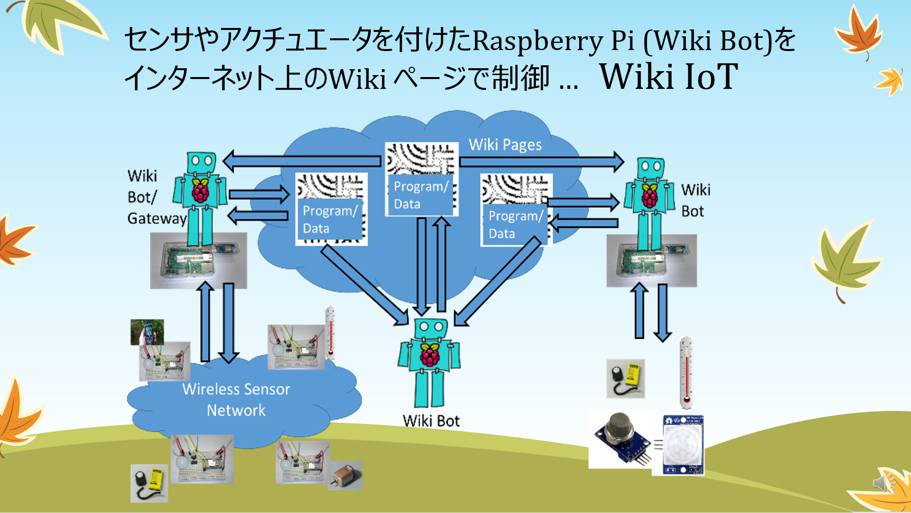 • 概要: インターネット上のWikiとLANに接続されたBot群によって構成されたIoTシステムを開発中である. このBot群はWikiに書かれたプログラムやコマンドで制御される. 今回, Raspberry Pi にI2Cデバイスを接続したBotにおいて, Wikiに書かれたプログラムによりそのI2Cデバイスの設定と入出力を行うことができるよう,このIoTシステムを拡張した. このことにより, このBotを一度このIoTシステムに参加させると, インターネット上のWikiページを書き換えることにより, その設定を行ったり, Wikiページ上でI2Cデバイスの入出力を行ったりすることが可能になる. 例として, 一つのBot(Bot-1)がI2C光センサの値を読み取ってWikiページに書き込み, もう一つのBot(Bot-2)が, そのWikiページに書かれた光センサの値を読み取り, その値によりサーボモータを動作させるシステムを試作した