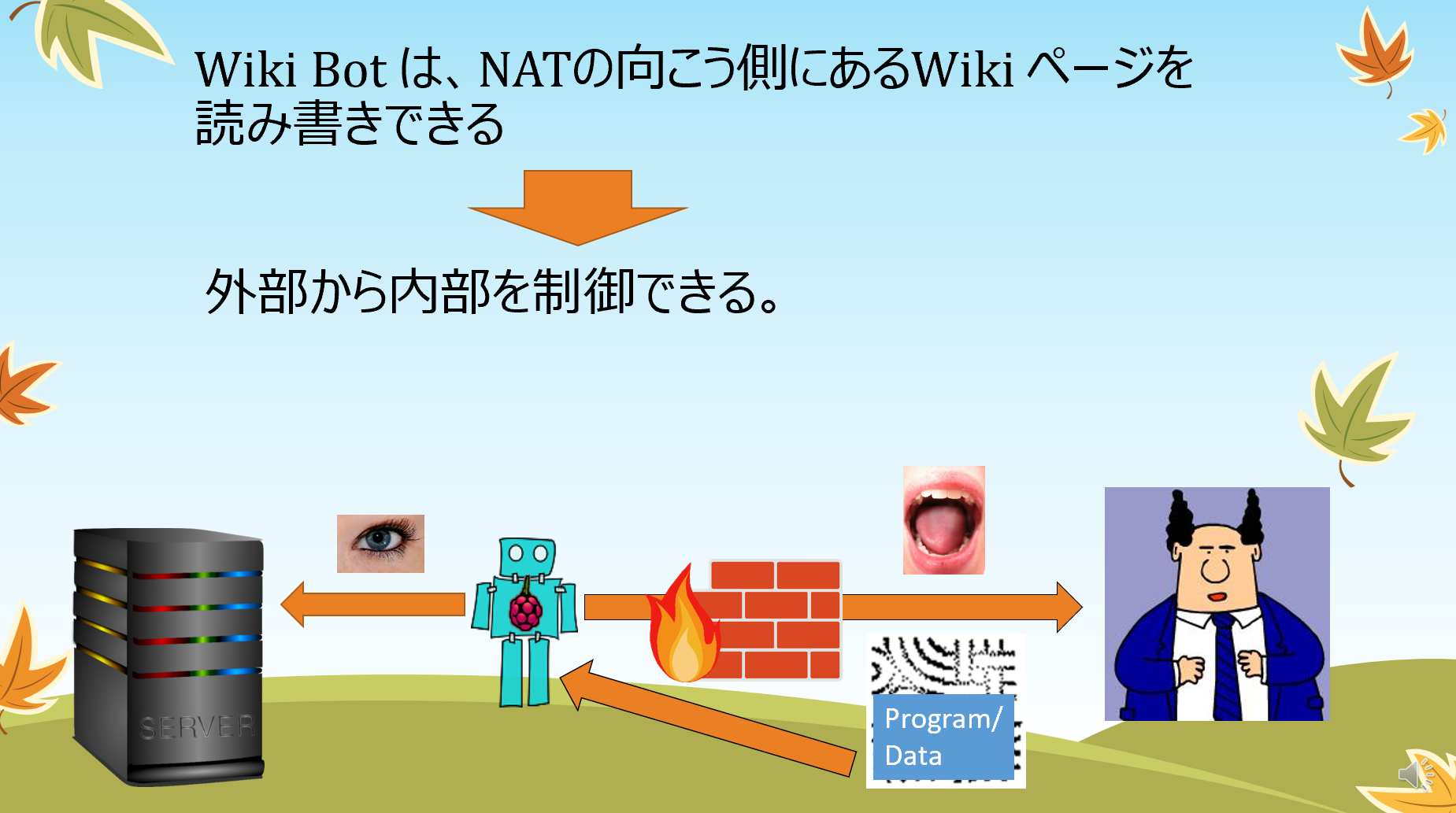 - 概要:インターネット上のWikiページにより, NAT (Network Address Translator router) 背後のセンサ端末の設定変更や制御が可能なIoT(Internet of Things)システムを利用して, サーバとサーバ室の監視を行うことについて述べる. ここで利用するIoTシステムはインターネット上のWiki ページと, Android 端末やRaspberry Pi に各種センサを接続して作られた Bot (Wiki Bot)で構成されている. Wiki BotはNAT背後に設置可能であり, このことにより, インターネットから行われる様々な攻撃に対する防御能力を大きくすることができる. また, 外部からは直接アクセスできない, NAT背後にある, サーバの状況をWiki Botによって把握し, この状況をインターネット上で閲覧可能にできる. Wiki BotはWikiページ上に書かれたコマンド列とプログラムで構成されたスクリプトを定期的に読み込む. そのスクリプトによって, Wiki Botに接続されたセンサの設定を行い, データを入力し, 簡単な処理を行い, 処理されたデータを Wiki ページに書きこむ. スクリプトに従ってTwitter でつぶやくことも可能である. Wiki Botは管理者がBotのプログラムを, Botのある場所に行って, 直接操作することなしに, インターネット上にあるWiki ページのスクリプトを書き換えることにより, Wiki Botのセンサの設定変更や, データのサンプリング間隔などの調整を行うことができる.