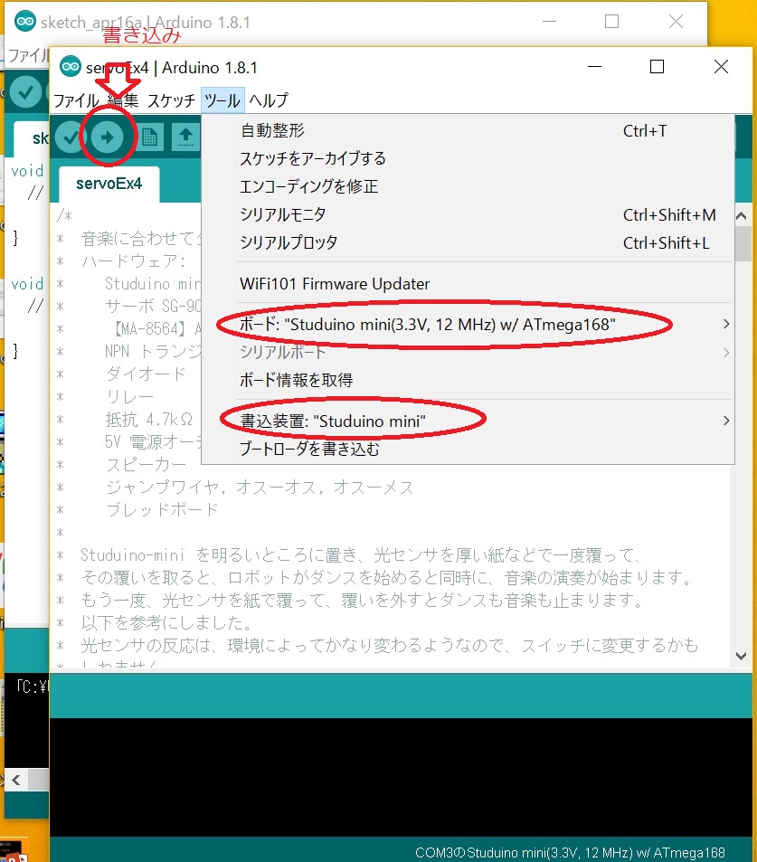 - ArduinoのIDEのツールのメニューで、下の図のように「ボード」を studuino mini、「書き込み装置」を studuino mini に設定し、右矢印のボタンをクリックして書き込みを始めます。