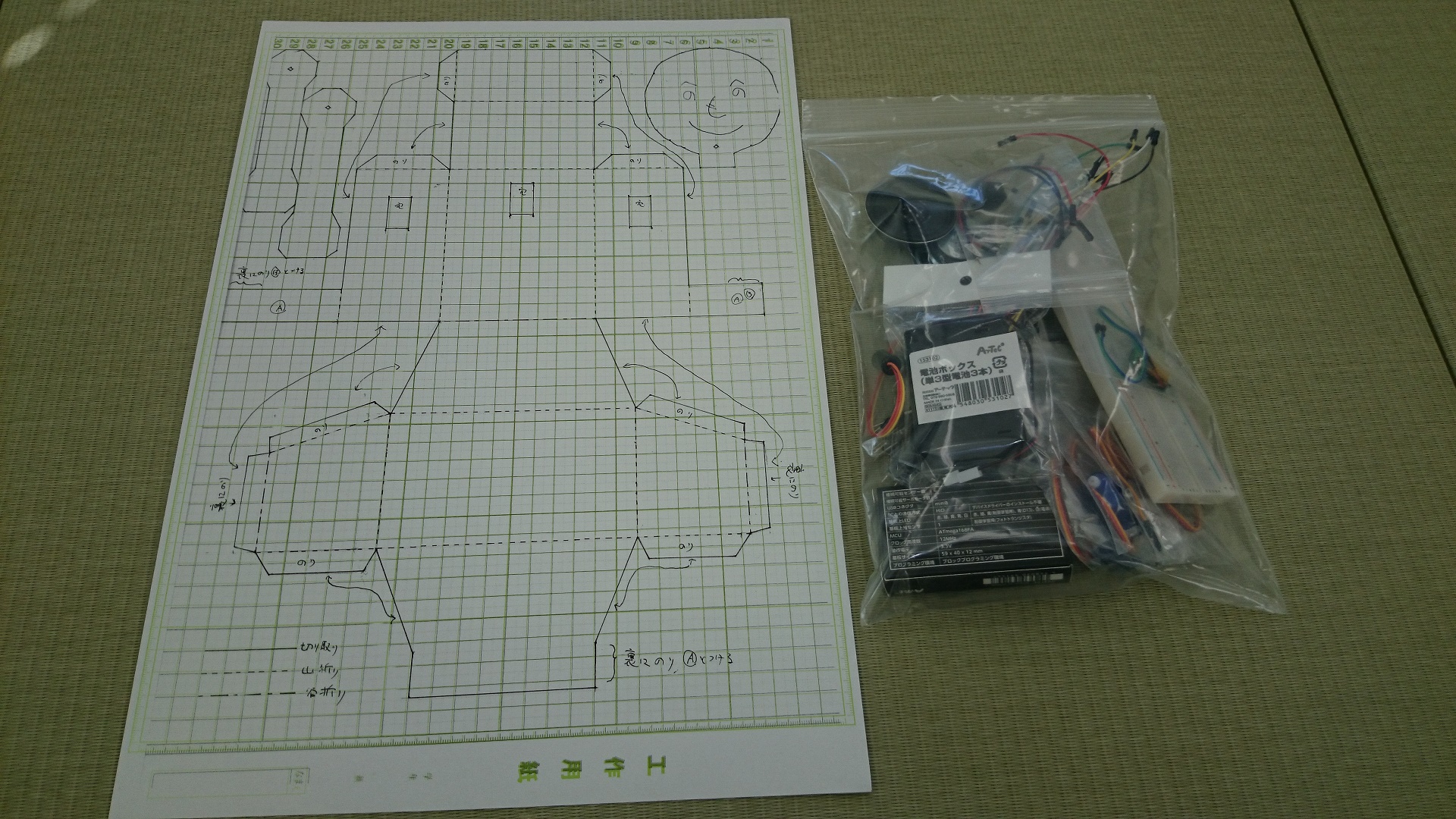 各自に配布する工作用紙と部品が入った袋 †