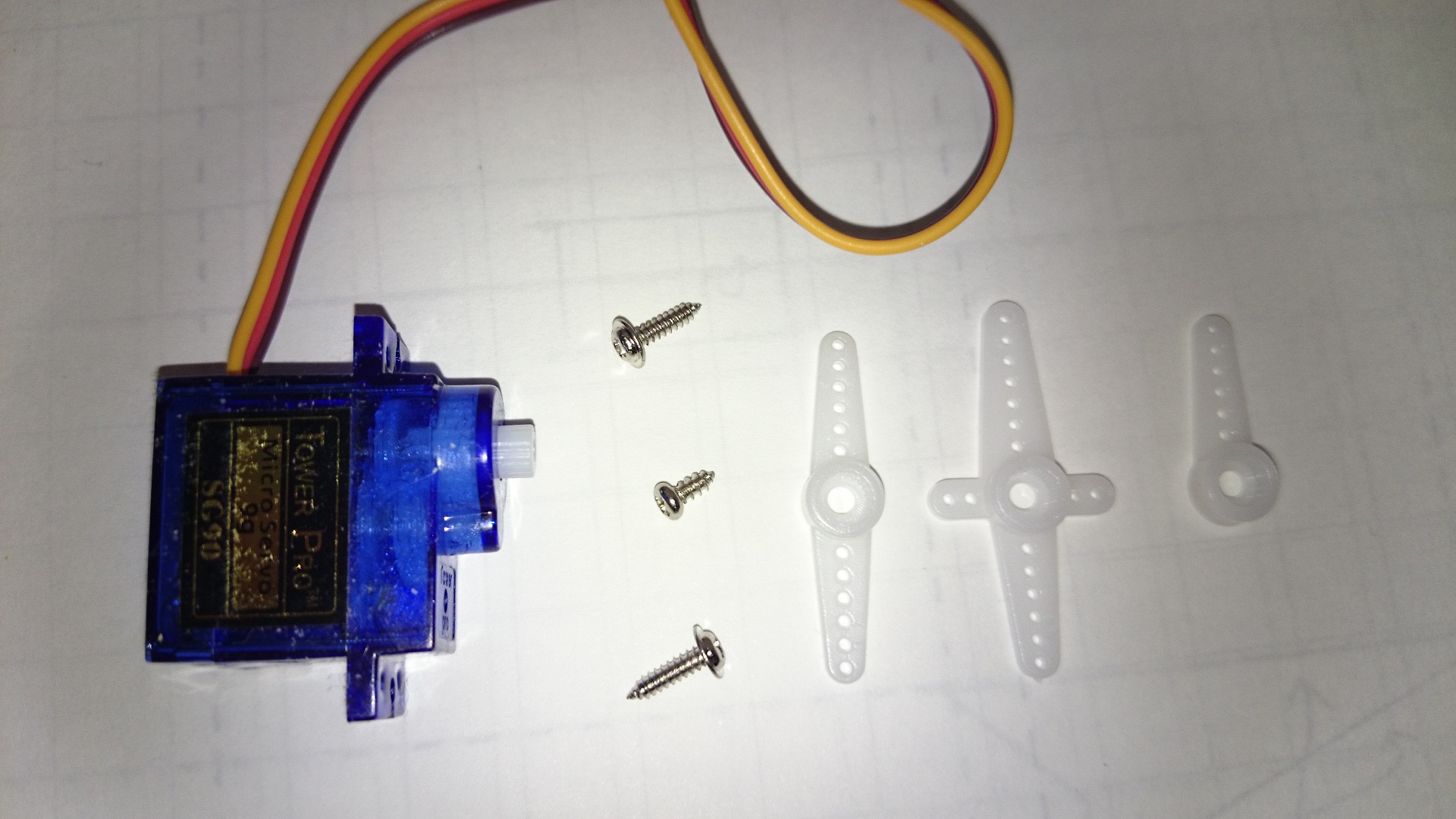 - 袋の中には本体、長いねじ2本、短いねじ1本、「ホーン」3種類が入っています。本体にホーンのどれかを短いねじで装着し、本体が入力されるパルス幅でホーンの位置を制御します。本 dancingRobotでは十字の形のホーンを使います。