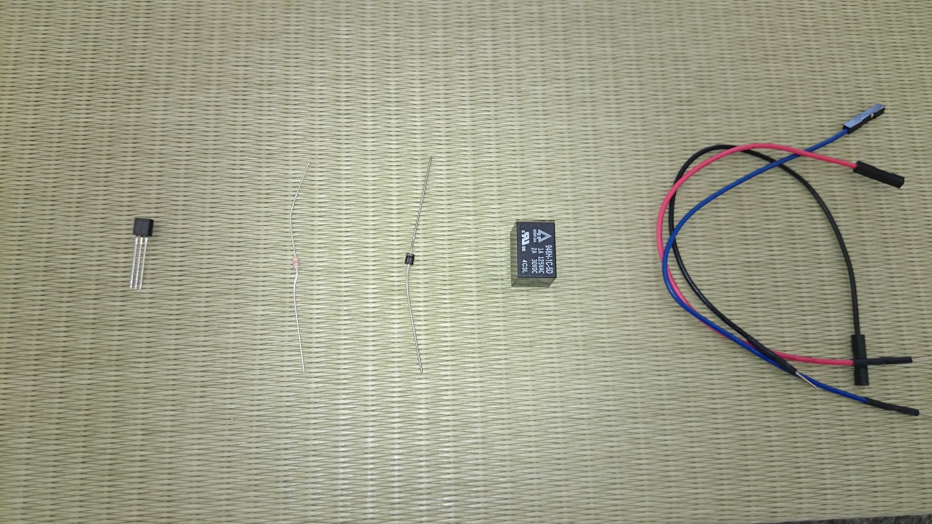 - 左からトランジスタ2SC1815, 4.7kΩの抵抗, ダイオード, 電磁リレー, Studuino-mini と回路を接続するためのジャンパワイヤ