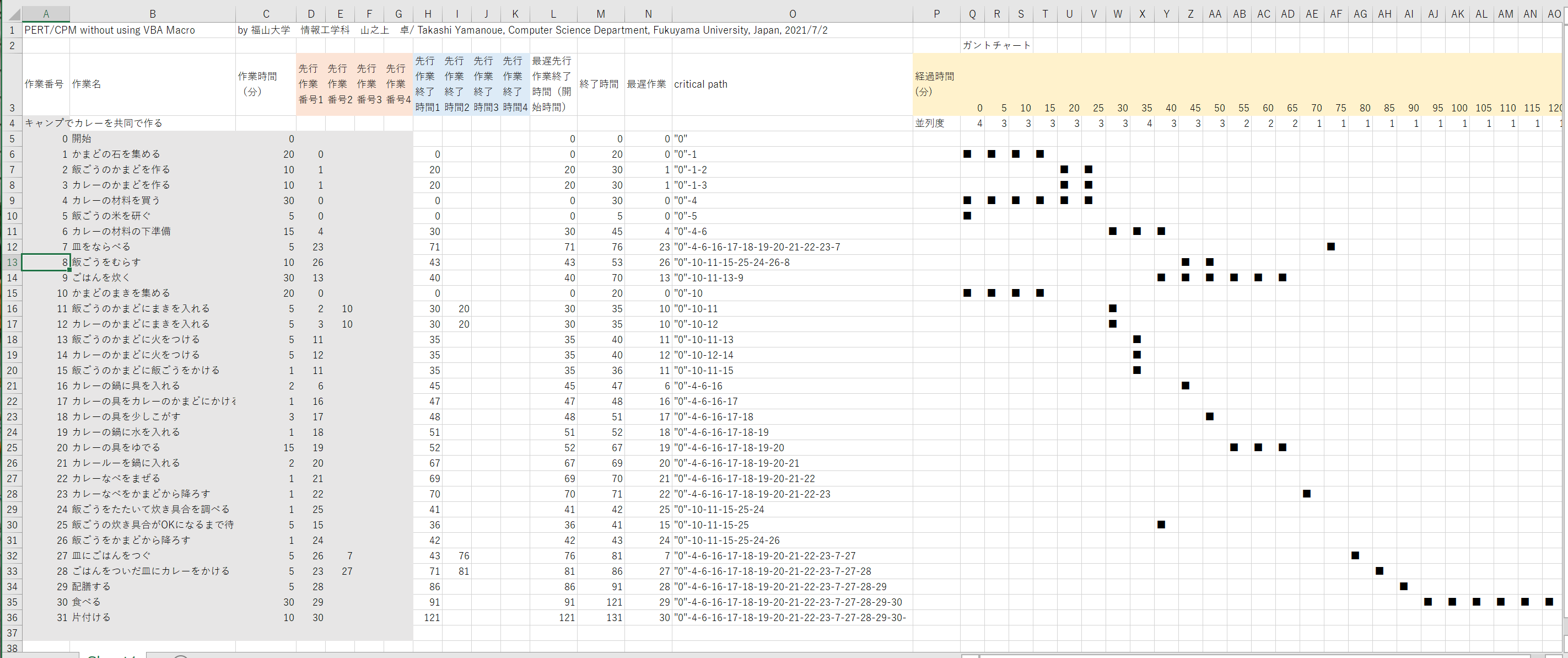 - D列からG列までは、その行の、先行作業項目の番号。H列からK列にかけて、それぞれの先行作業項目が終了するまでの時間を計算。