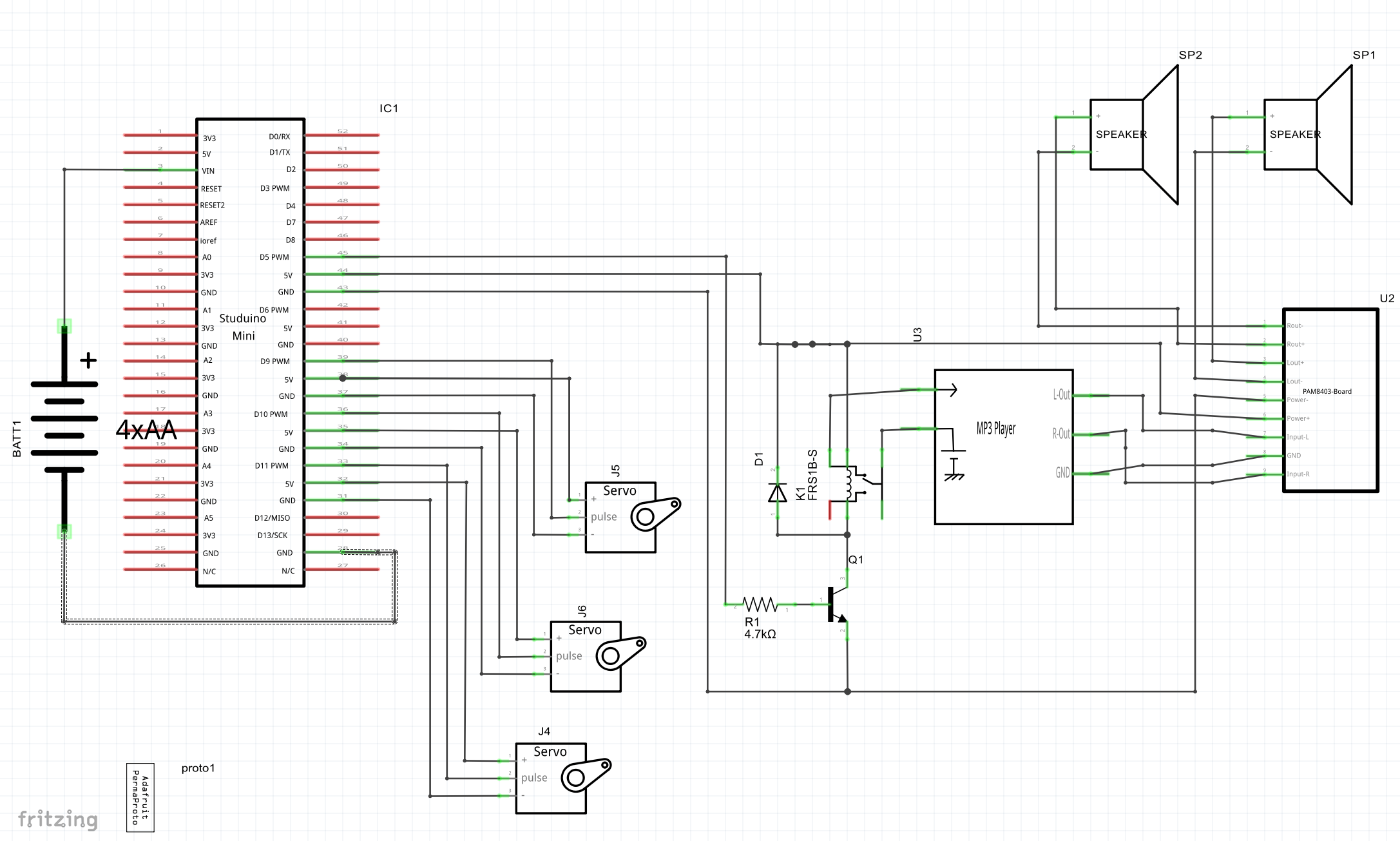 - サーボモータの制御とMP3プレイヤーのOn/Offの制御はStuduino Mini によって行います。