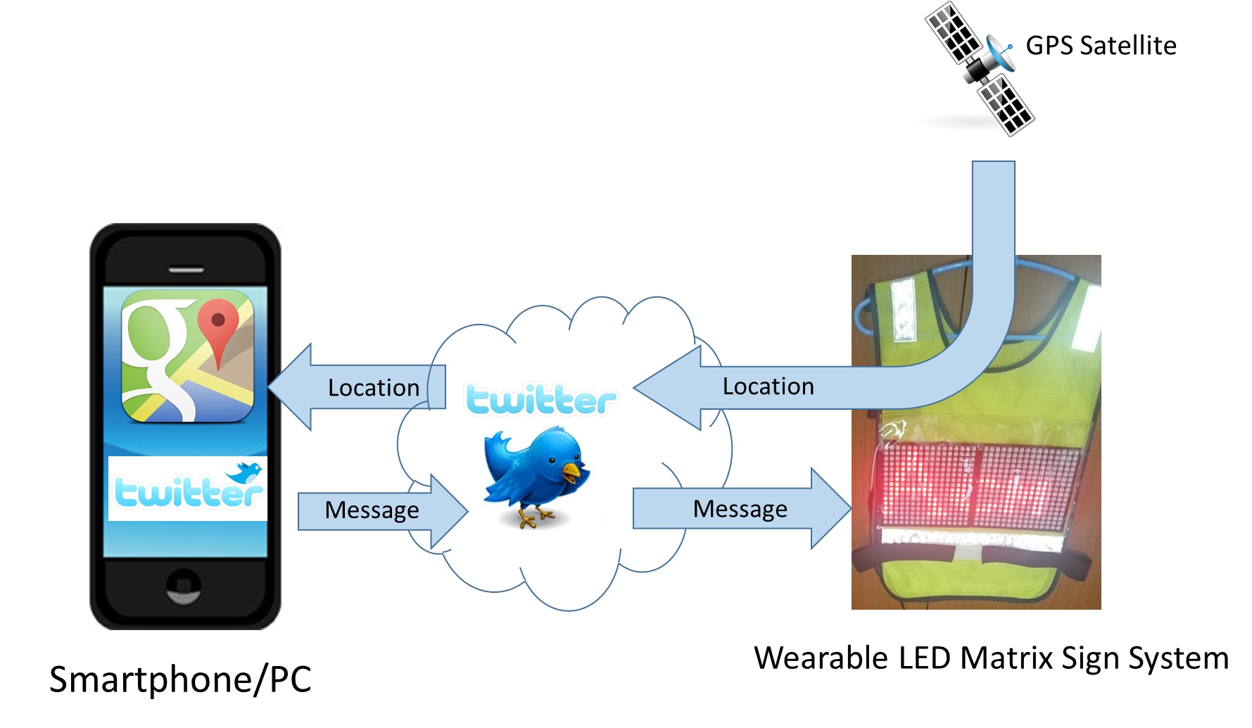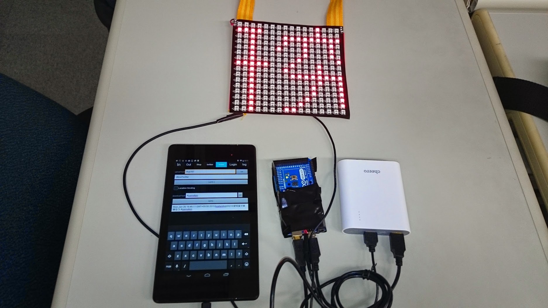 - 着るLED Matrix 電光掲示板は、特定のハッシュタグが付いた twitter のつぶやきを Android 端末が twitter から抽出し、そのつぶやきを文字フォントの bitmap に変換して Arduino Mega ADK に送り、Arduino Mega ADK (Arduino)がその信号を NeoPixel?? LED Matrix 表示用に変換して シリアル信号として NeoPixel?? LED Matrix に送っています。